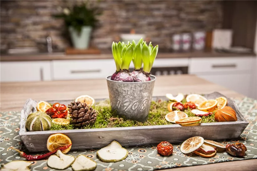 Damit Hyazinthen zu Weihnachten blühen, sollten sie schon im September mit dem Treiben beginnen. Damit sie rechtzeitig blühen, muss man ihnen zuerst einen Winter „vorgaukeln“. Dies geschieht durch Lagerung im Kühlraum. Solch behandelte Hyazinthen tragen auf der Packung den Hinweis „zur Treiberei geeignet“. Setzen Sie die Zwiebeln in ein mit Wasser gefülltes Hyazinthenglas oder pflanzen Sie sie in Erde, sodass nur noch die Spitze zu sehen ist. Die Zwiebeln sollten zuerst kühl und dunkel stehen. Erst im Dezember werden die Töpfe nach und nach ins helle, warme Zimmer gestellt, damit sich die Blüten entwickeln.
