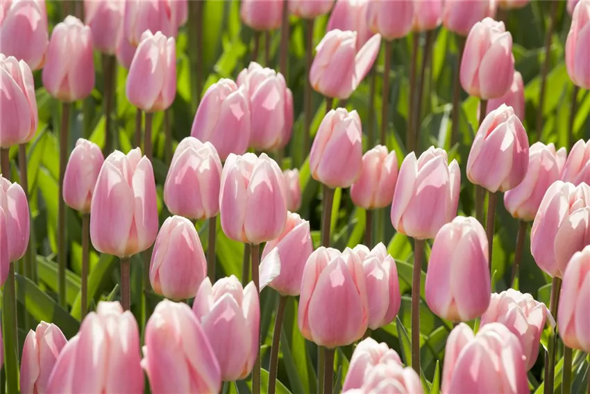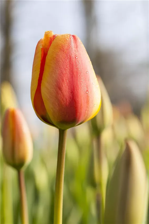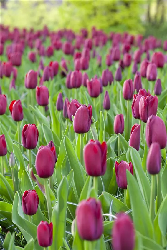 Triumph-Tulpen blühen etwas später als viele ihrer Artgenossen. Deshalb zählen sie zur Gruppe der Mittelfrühen Tulpen.Um das Jahr 1920 herum wurden sie aus einer Kreuzung zwischen Frühen Tulpen und Darwin-Tulpen gezüchtet. Damals noch in kleinstem Bestand gepflegt, zählen sie heute zu den wichtigsten Pflanzen für die Tulpenvermehrung, gerade auch für beschleunigtes Wachstum. Triumph-Tulpen haben farbenfrohe Blüten und einen festen Stiel, der bis zu 50 Zentimeter hoch werden kann. Ihre Blätter stehen aufrecht und unterstreichen die Präsenz der Blüte mit einem frischen Grün. Dadurch sind Triumph-Tulpen etwas größer als frühblühende Sorten und eignen sich hervorragend als Schnittblumen. Ihre breite Kelchblüte präsentieren sie von Ende April bis Mai. Es gibt sie in allen möglichen Farben: von hellen Weiß- und Gelbtönen bis zu dunklem Violett. Viele Blüten sind zweifarbig gemustert.