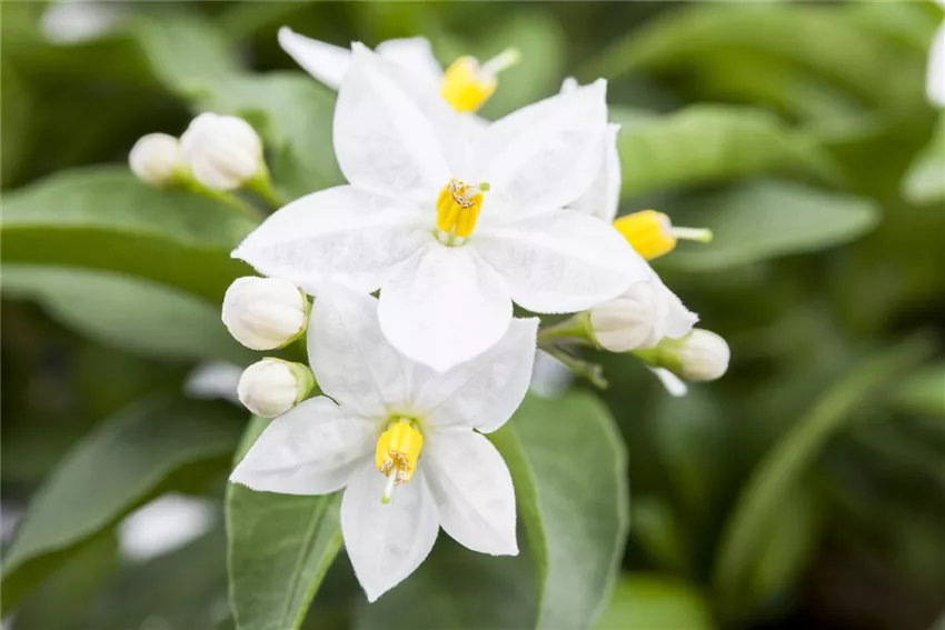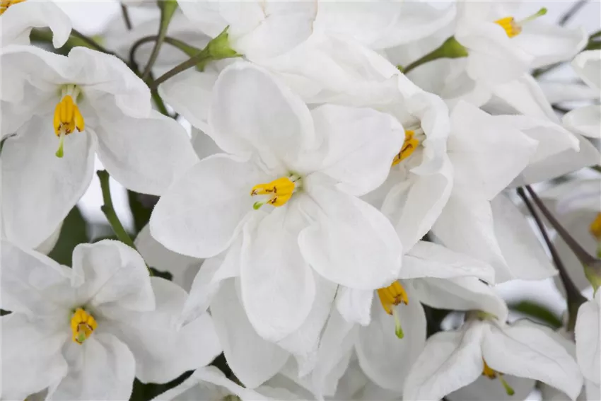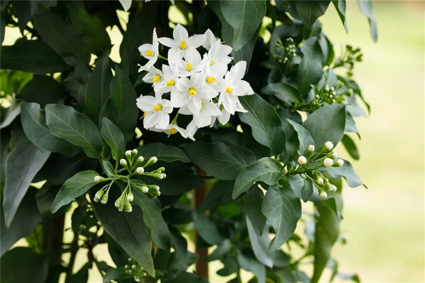 Solanum jasminoides Dass der Sommerjasmin zu den Nachtschattengewächsen gehört ist in Anbetracht der wunderschönen Blüten der Pflanze absolut unverständlich. Die weißen Blüten haben nichts mit einem Nachtschatten gemeinsam.