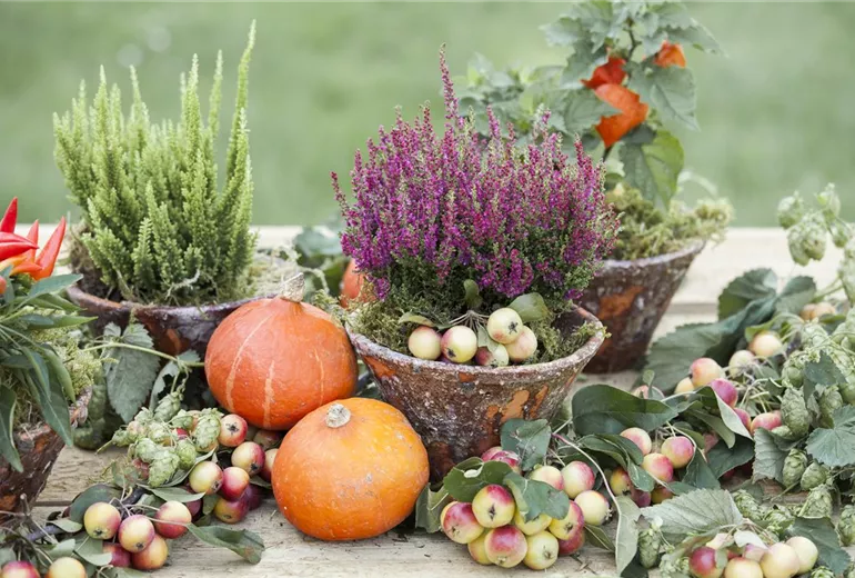 Schon eine einzelne, einfache Blüte fällt mehr auf, wenn sie von kräftig grünen Blättern, Gräsern, Farnen oder Kräutern umgeben ist. Ihren herbstlichen Dekorationen mit Chrysanthemen oder Astern können Sie durch Zweige mit bunten Früchten der Jahreszeit individuelles Flair verleihen. Außerdem bekommen die Sträuße mehr Fülle und lassen sich besser binden – eine wertvolle Hilfe vor allem bei unbelaubten oder starren Blütenstängeln, z.B. Gerbera oder Rosen. Auch Ungeübten gelingt so ein üppiges Blumengebinde. Gleichzeitig unterstreichen die Zutaten die Wirkung der Blüten oder fügen sich, farblich aufeinander abgestimmt, harmonisch in die Dekoration ein. Kräuter verströmen zusätzlich einen zarten Duft nach Sommer frische. Gräser mit überhängenden Rispen sorgen für Dynamik und Schwung.
