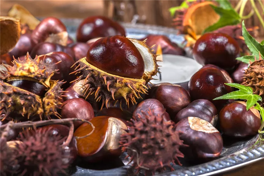 Kaum eine Baumfrucht dürfte Klein und Groß so faszinieren wie die Kastanien, die vom gleichnamigem Baum fallen. Auch wenn es verschiedene Sorten gibt – in Europa kennen wir vor allem die Edelkastanie. Auch die Rosskastanie ist verbreitet – sie hat ein ähnliches Aussehen. Die Kastanien wurden früher für die Behandlung von Pferden eingesetzt, was den zweiten Teil des Namens erklärt.