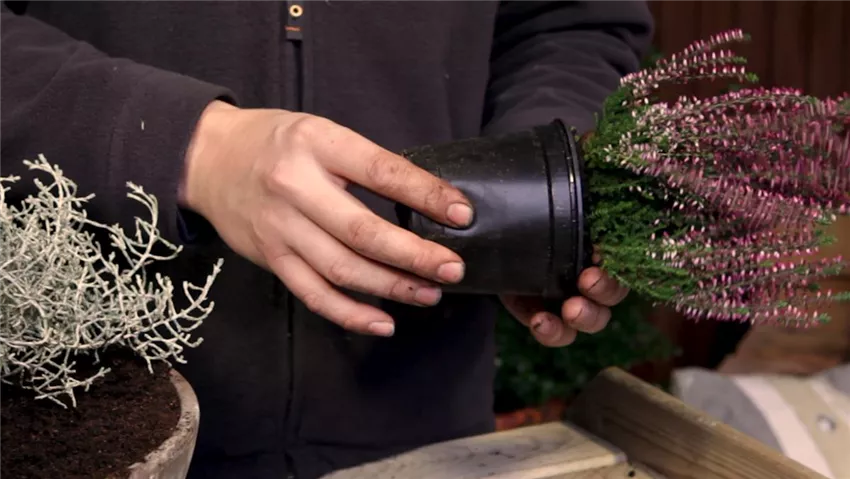 Damit die herbstlichen Pflanzen im Kübel gut gedeihen können, werden die Wurzeln vorsichtig befreit. Dann gibt man die Pflanze in die Erde.