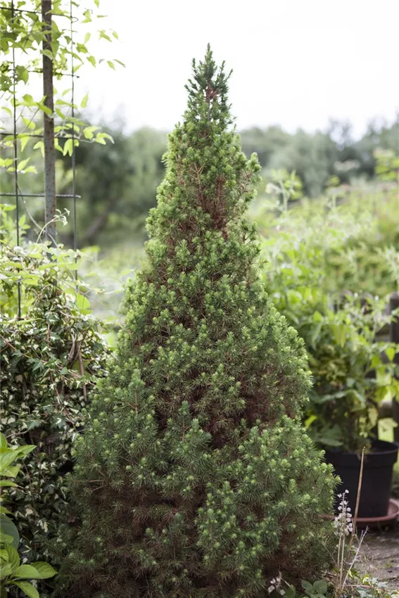 Die Zuckerhutfichte besticht mit ihrer ausgefeilten geometrischen Form. Sie ist eine kleine, feine Fichten-Variante und wie gemacht für kleinere Gartenflächen.