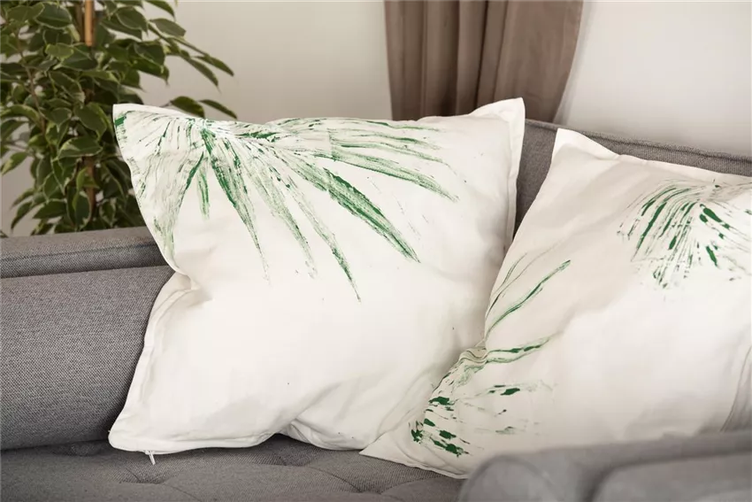 Besonders schön machen sich besondere Blätter auf Textilien im Wohnzimmer. Kissen lassen sich im Handumdrehen von schlichtem Weiß in ein dekoratives Kissen mit Pflanzenmuster verwandeln. Und das super einfach, schnell und günstig.