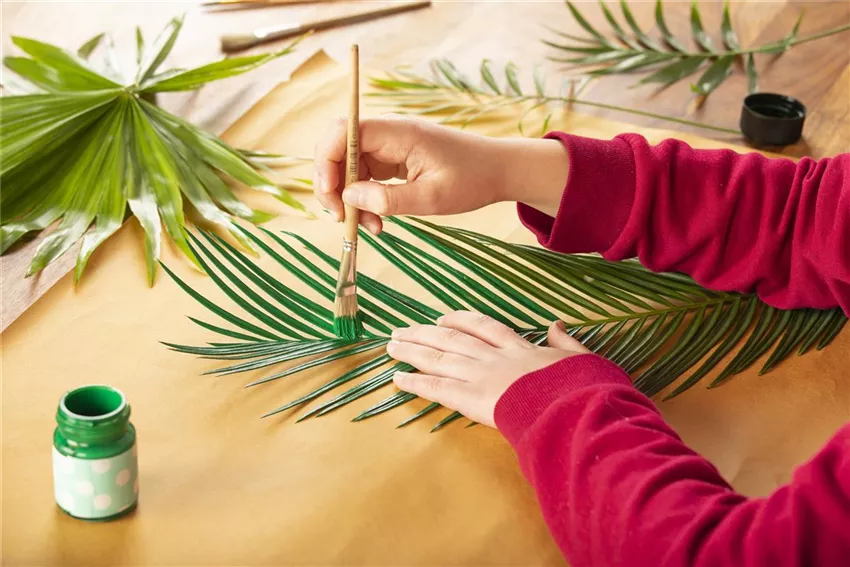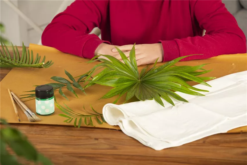 Sofakissen bekommen mit einem außergewöhnlichen Muster ein ganz besonderes Aussehen. Dafür eignen sich am besten einfarbige Kissenhüllen, da das bedruckte Muster ja später im Vordergrund stehen und nicht untergehen soll. Je nach Einrichtung und Vorlieben können das weiße, schwarze oder andersfarbig Kissenhüllen sein. Wichtig sind aber die Hüllen, da diese später gebügelt werden müssen. Die Auswahl der Blätter ist riesig. Monstera, Kentia-Palme und Co. haben jede Menge aufregende Muster und Strukturen zu bieten und eignen sich für den Druck besonders gut. Dazu kommt noch Textilfarbe in der gewünschten Farbe und ein Pinsel und ein Bügeleisen.